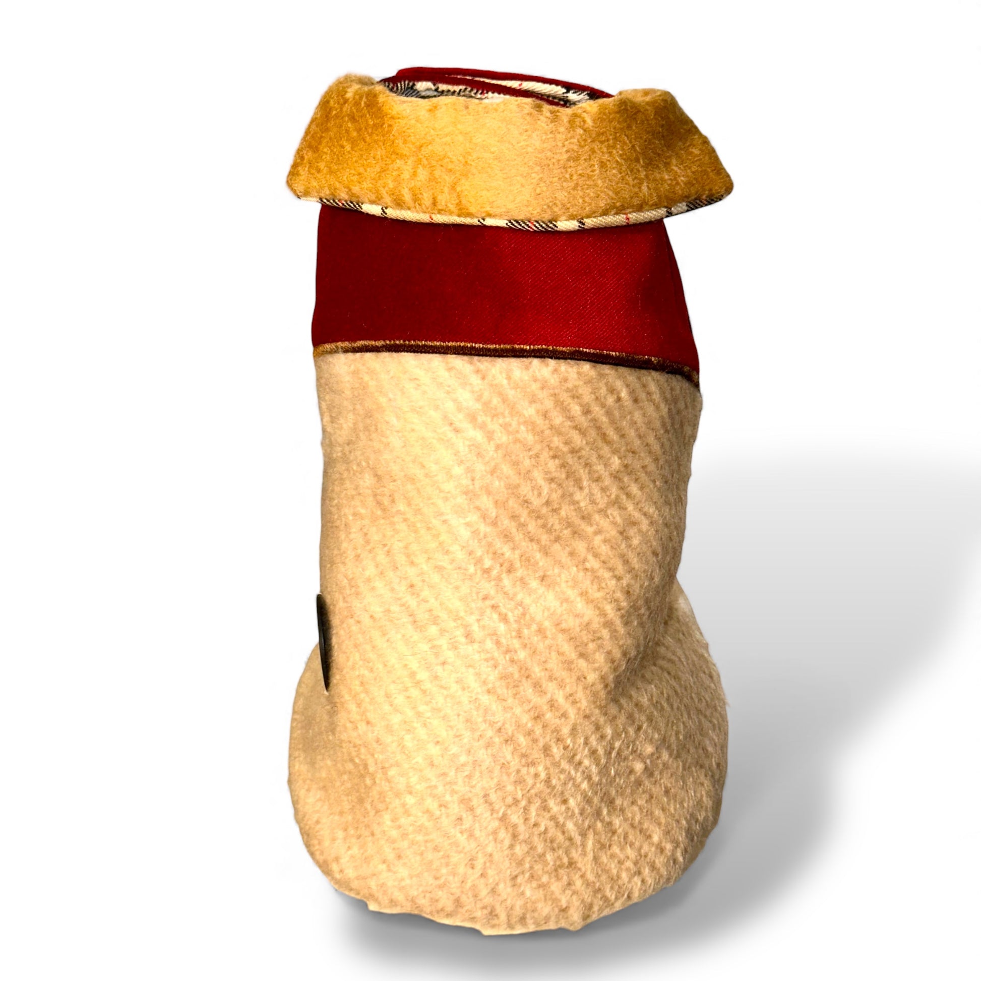 Manteau Chien Luxe – Col Camel en Cachemire Façon Zibeline, Dos Bicolore Bordeaux & Rayures Beige-Camel – Pièce Unique, Taille M